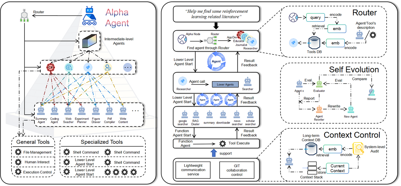 Our core design philosophy uses an "agent-as-a-tool" mechanism to achieve automated decomposition and distribution of complex tasks. The entire architecture presents a pyramid-like hierarchical structure: the top layer contains a root agent receiving user initial tasks; layers below contain numerous planning and routing agents that don't execute tasks directly but decompose complex problems into more granular subtasks; ultimately, all atomic tasks are delegated to bottom-level functional agents for execution.