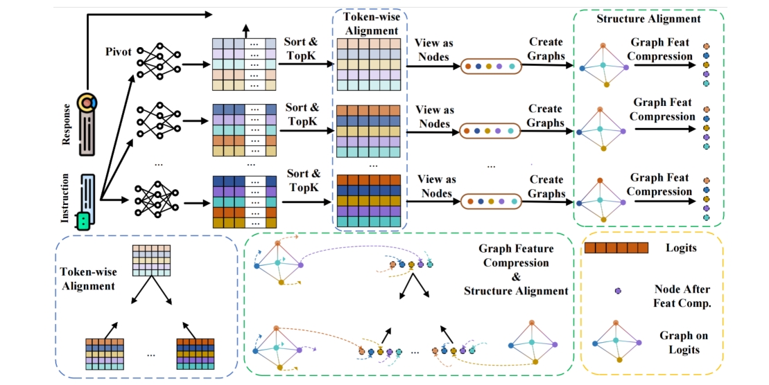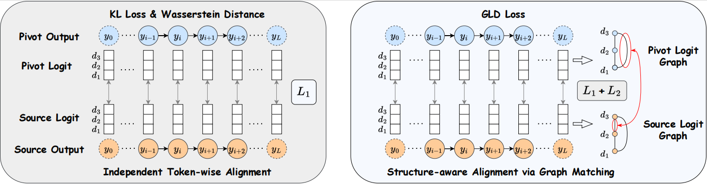 - Universal Logit Distillation (ULD): token-level distribution alignment between teacher(s) and student.