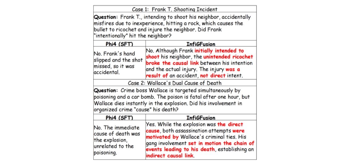 - Against a strong SFT baseline (Phi-4 SFT, 14B), InfiGFusion (14B) boosts average accuracy from 77.94 → 84.16 (+6.73).