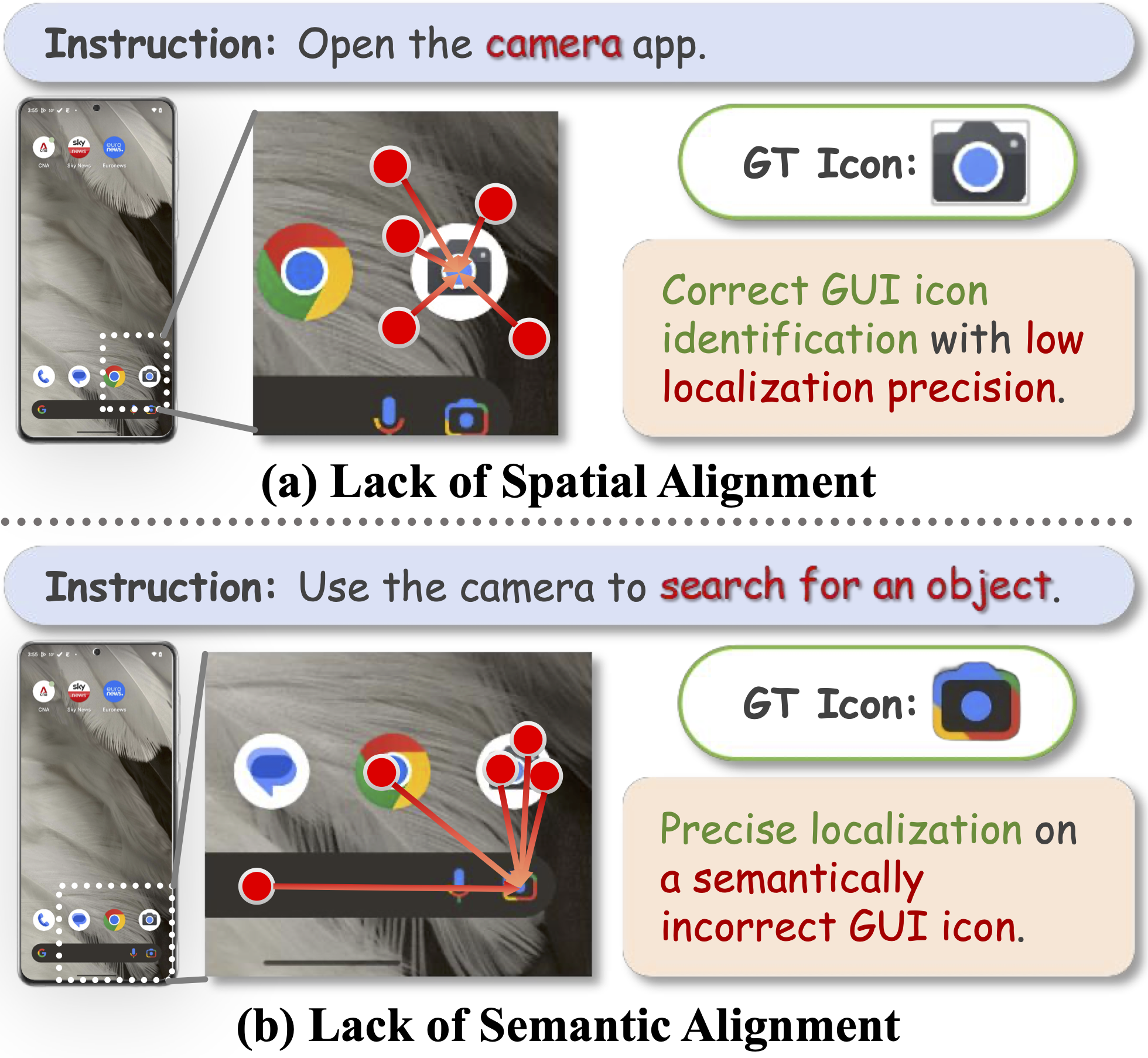 Following the InfiGUI-R1, we observe that Reinforcement Learning with Verifiable Rewards (RLVR) improves data efficiency by optimizing sequential coordinate generation, thereby enhancing spatial alignment. However, all existing RLVR methods suffer from a critical yet overlooked limitation: inefficient exploration. Because they sample actions solely from the model’s current policy, these methods tend to over exploit high-confidence errors, a phenomenon we term the confidence trap. Once trapped, the model repeatedly chooses an incorrect action with high confidence, failing to explore alternative actions that—although low probability—may be correct. This bottlenecks semantic alignment.