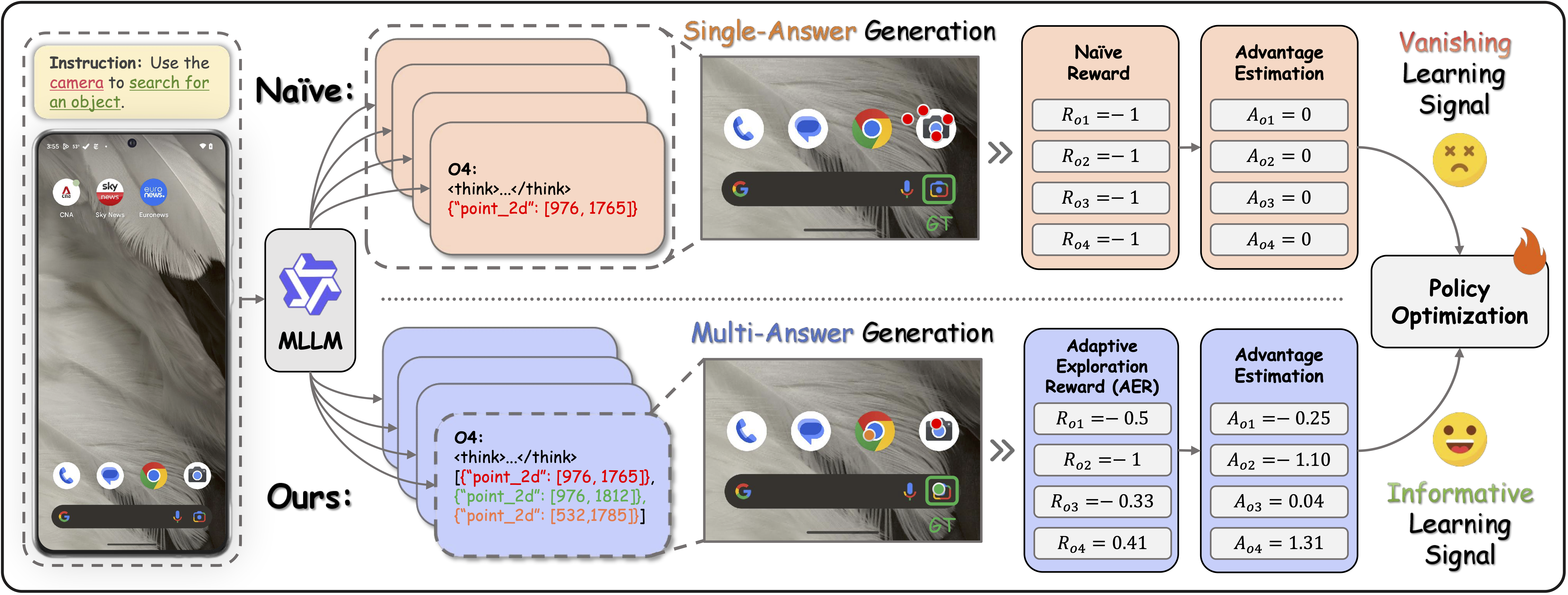 In this work, we introduce Adaptive Exploration Policy Optimization (AEPO), a novel policy optimization framework for multimodal large language models that addresses semantic alignment challenges in GUI grounding. Using multi-answer generation and theoretically grounded Adaptive Exploration Reward, InfiGUI-G1-3B and InfiGUI-G1-7B achieve state-of-the-art performance with up to 8.3% relative improvement over baseline methods.