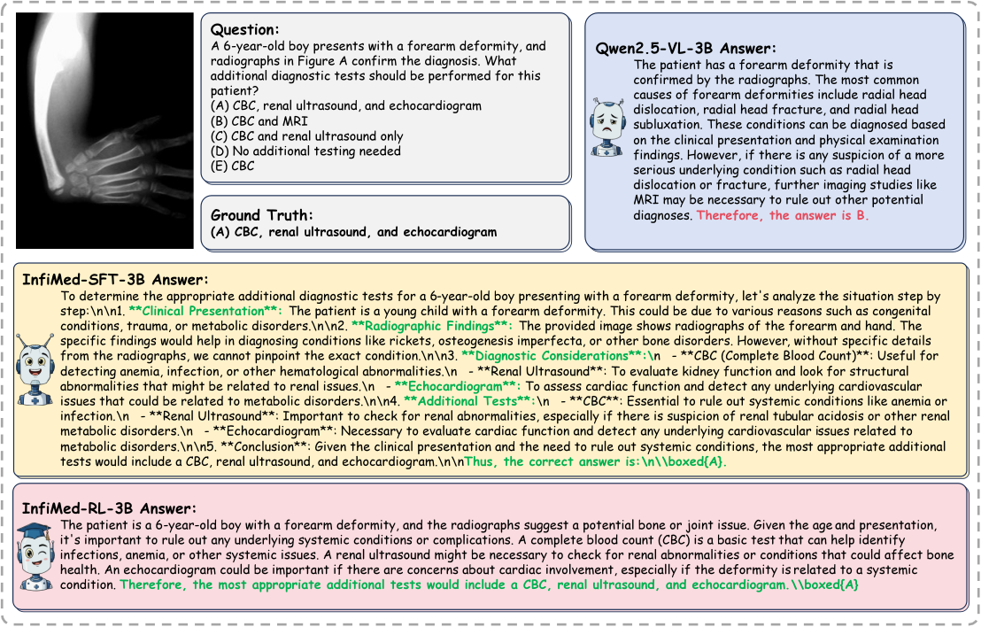 Comparative analysis reveals that InfiMed-RL-3B delivers the most direct and accurate answers. In contrast, InfiMed-SFT-3B sometimes requires lengthy analysis or "reflection" steps to reach the correct conclusion. This validates that the RLVR stage effectively enhances the model's decision-making efficiency and final accuracy, making it more suitable for high-stakes scenarios such as clinical or diagnostic assistance.