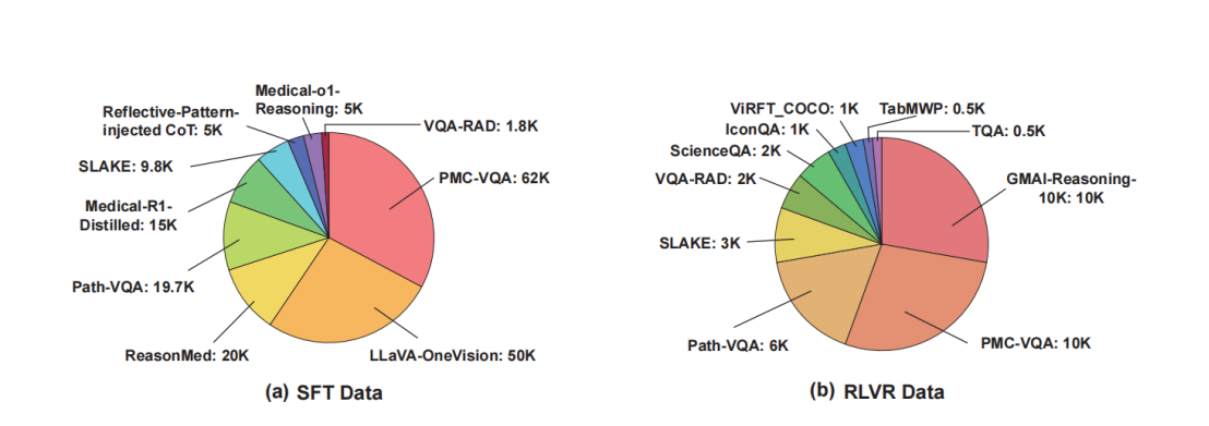 - Mixed Data & Multi-Dimensional Rewards: Integrating medical textual data, medical multimodal data, and general multimodal data in the SFT phase, and combining them with multi-dimensional rewards during the RLVR phase, enhances accuracy and generalization despite the limited availability of high-quality medical data.