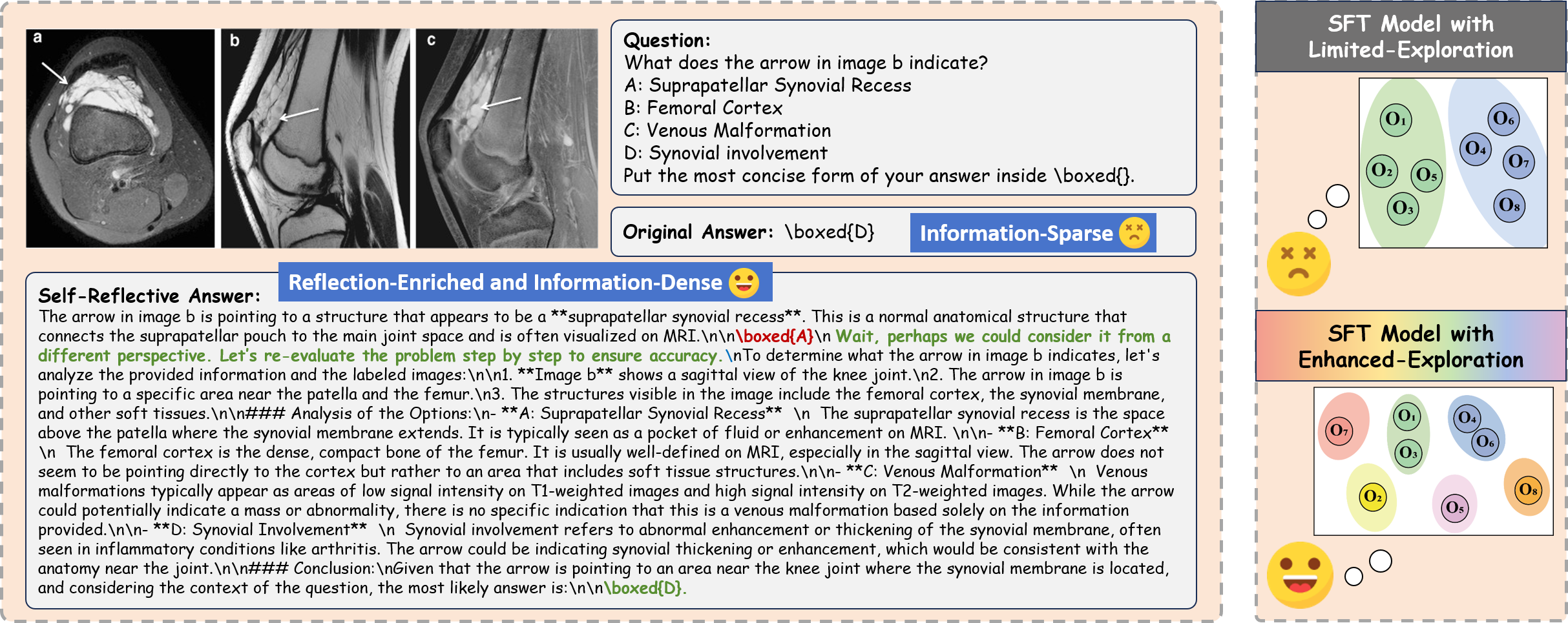 - Early Infusion of Reflective CoT: Introducing Reflective Chain-of-Thought during fine-tuning equips the model with self-reflection and generates richer candidate answers for subsequent RLVR, while data quality is safeguarded through rejection sampling and cross-model verification to ensure accuracy and reliability.