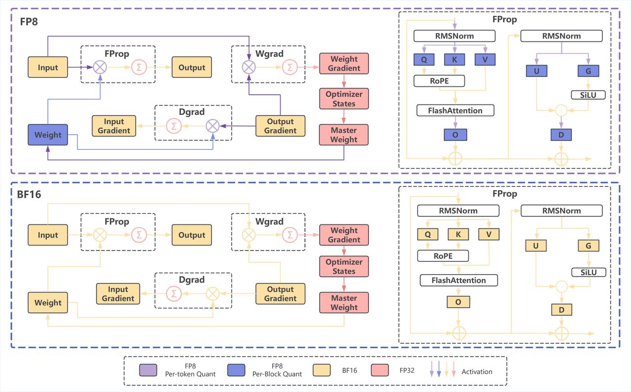 - Hybrid-Granularity Quantization: InfiR2 implements finer-grained FP8 quantization for computationally intensive operators, as shown in Figure 1: -For Linear/GEMM operations, it applies block-wise quantization to weights and token-wise quantization to activations. This balances accuracy with computational speed to fully leverage the hardware value of Tensor Cores. -For critical components like Master Weights, Optimizer States, and Gradient Accumulation, it employs a high-precision strategy for direct optimization and updates, effectively providing a "safety belt" for the most crucial parts of model training.