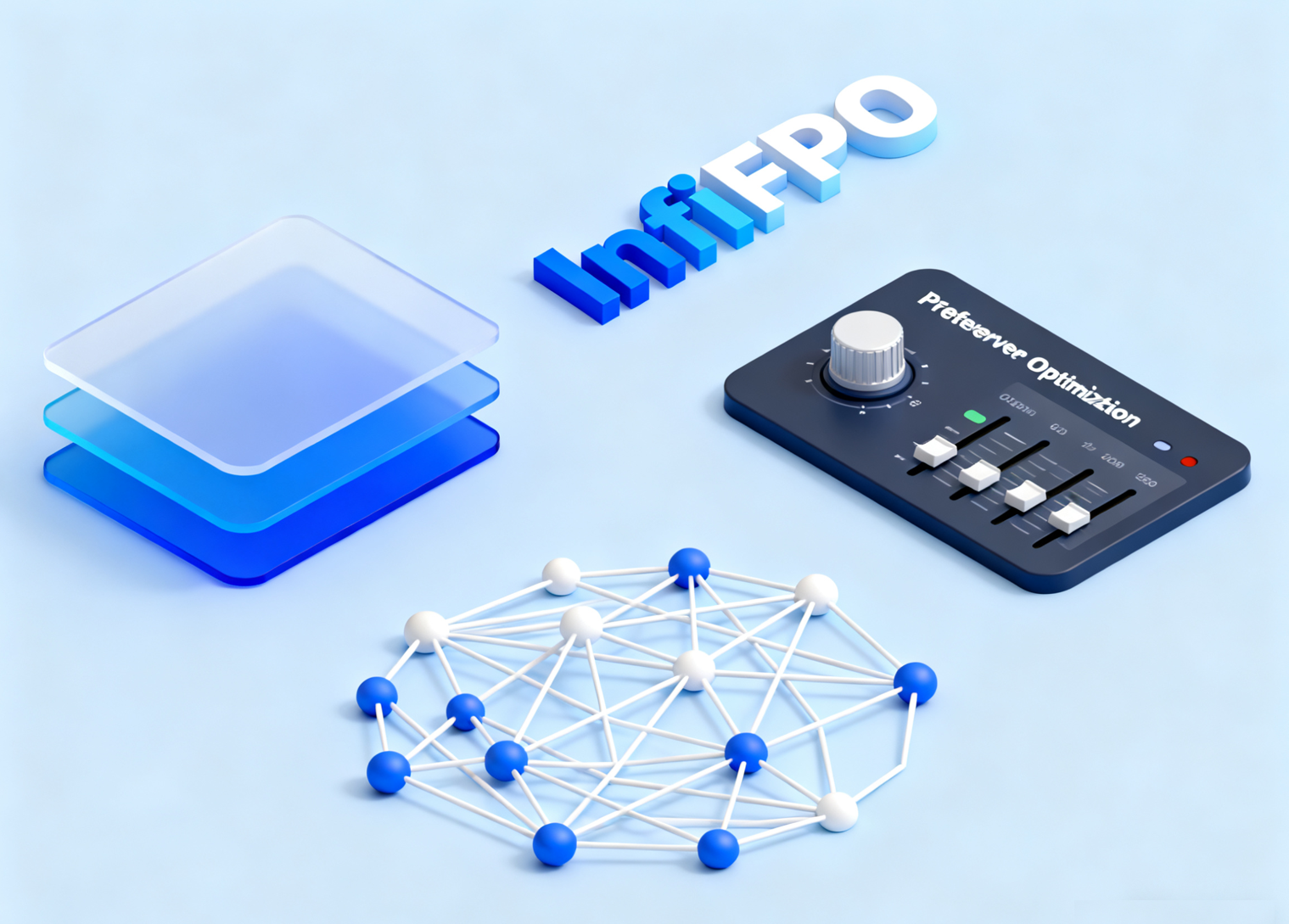 InfiFPO’s beauty lies in its mathematical foundation. By replacing the reference model in Direct Preference Optimization with a carefully fused source model, we create an optimization objective that simultaneously: